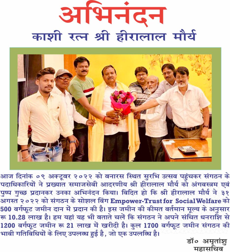 हम यहाँ वाराणसी के समाजसेवी काशीरत्न श्री हीरा लाल मौर्य के प्रति ह्रदय से आभार व्यक्त करते हैं जिहोने डॉ० अमृतांशु के आग्रह पर ट्रस्ट के के नाम ५०० वर्ग फुट जमीन दान दिया. इसके पश्चात ट्रस्ट के नाम कुल १७०० वर्ग फुट जमीन हो गई. इस जमीन पर शक्ति भवन के नाम से कार्यालय, सभागार और मेधावी गरीब बच्चों के अध्ययन हेतु छ कमरे बनायें जाने की योजना है. शक्ति भवन की आधार शिला १४ अप्रैल २०२३ को रखी गई थी . संगठन के लिए यह एक अविस्मरणीय दिन था. संगठन अपने सदस्यों एवं कार्यकर्ताओं और प्रतिनिधियों के प्रति आभार व्यक्त करता है.