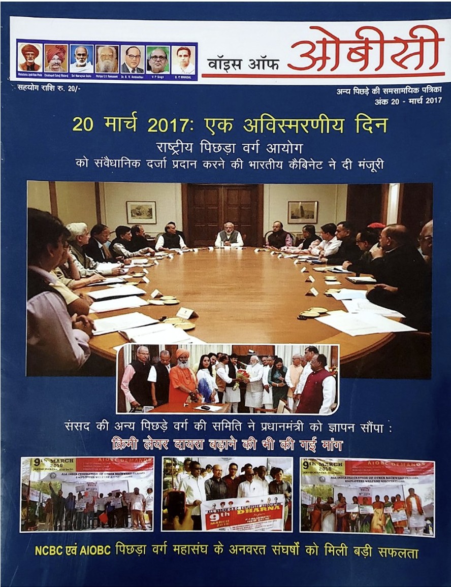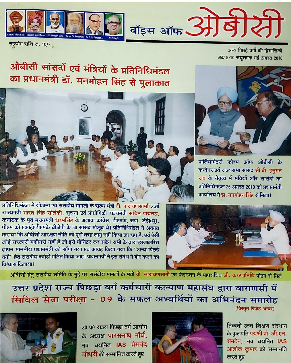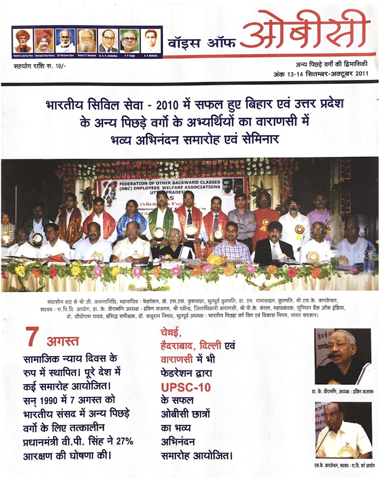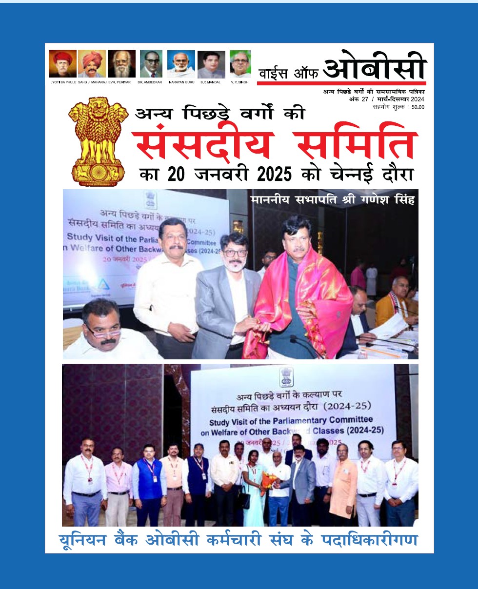 Voice of OBCs is a Hindi-English bilingual news magazine, which has been publishing since 1st January 2009. It is a completely informative and publishing on periodical basis. GO,  DoPT, MoF guidelines, related to OBCs (Employees / Public), Creamy Layer guidelines etc. are published to make OBCs people aware of the rules and privileges. We hope people will be benefited from this magazine. – EDITOR