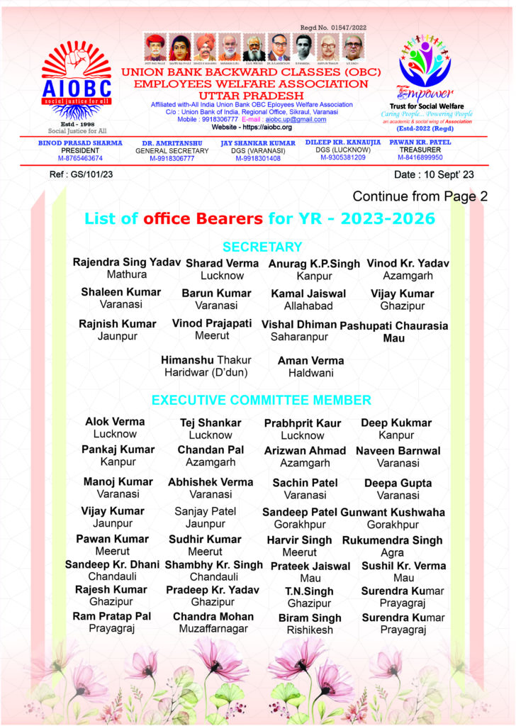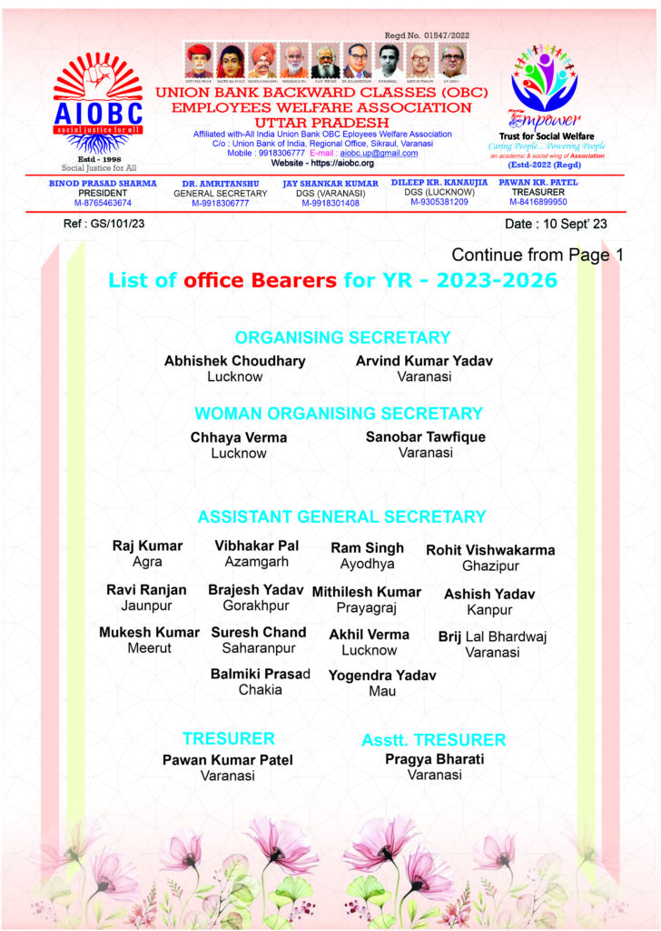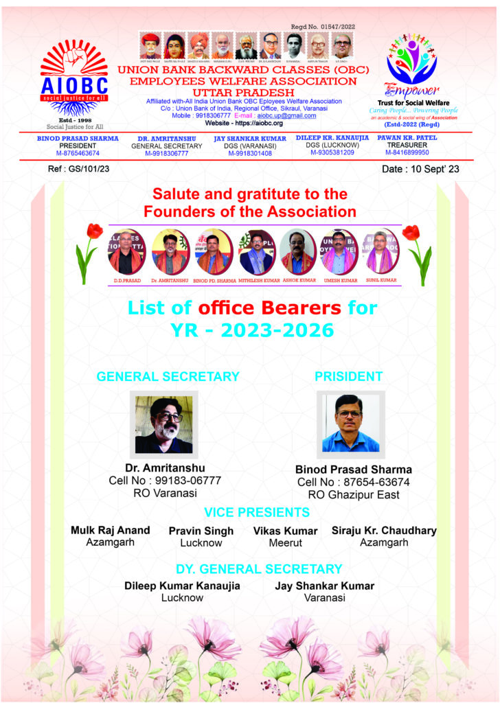 इस पेज पर हम यूनियन बैंक अन्य पिछड़ा वर्ग कर्मचारी कल्याण संघ, उत्तर प्रदेश के पदाधिकारियों के नाम प्रदर्शित करेंगे. वर्तमान में वर्ष २०२३ से २०२६ के लिए चुने गए पदाधिकारियों के नाम निचे दिया जा रहे हैं .